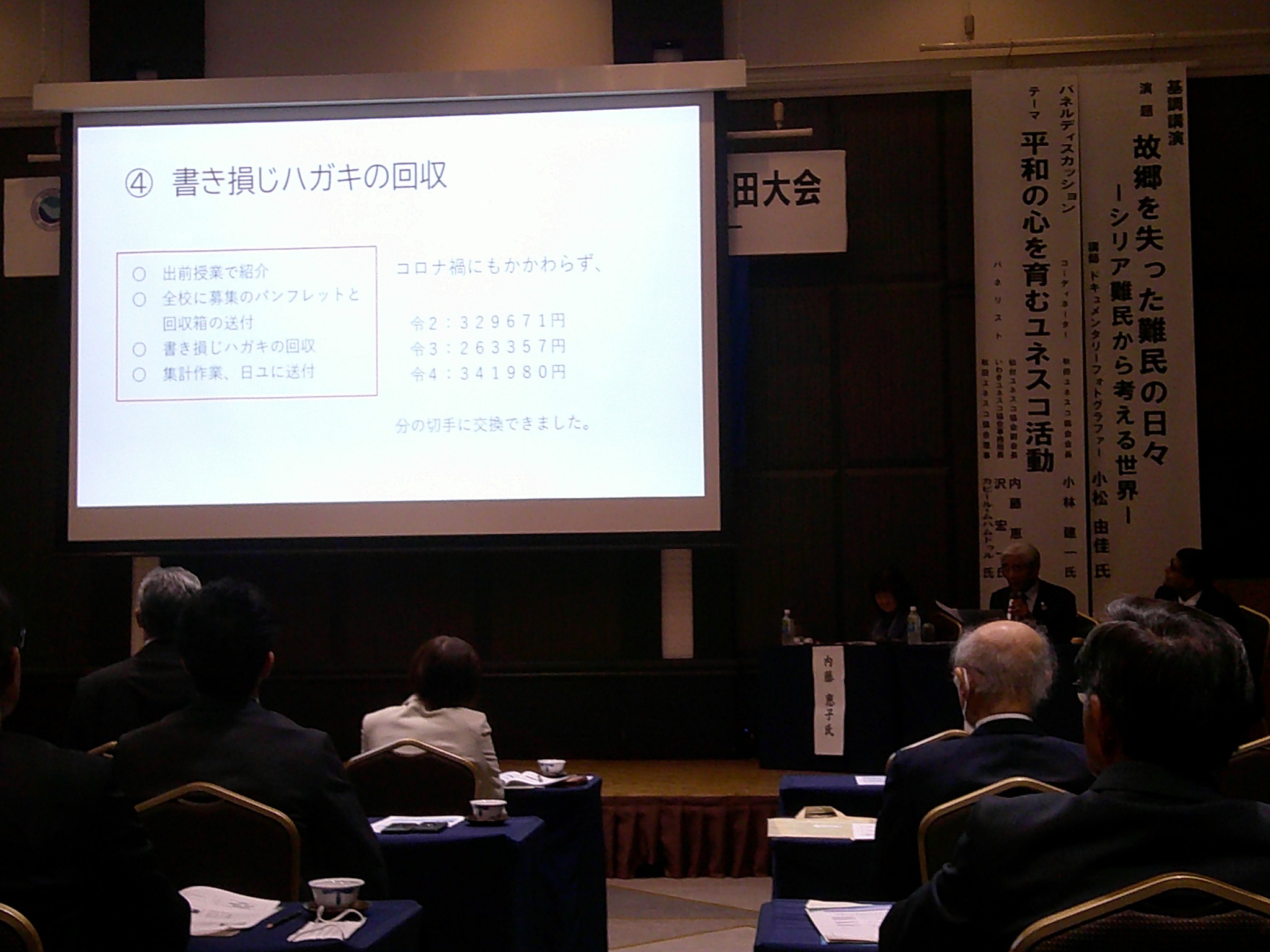 パネルディスカッションは「平和の心を育むユネスコ活動」をテーマに仙台ユネスコ協会内藤副会長、いわきユネスコ協会沢事務局長、秋田ユネスコ協会カビールムハムドール理事から各協会独自の活動紹介がありました。