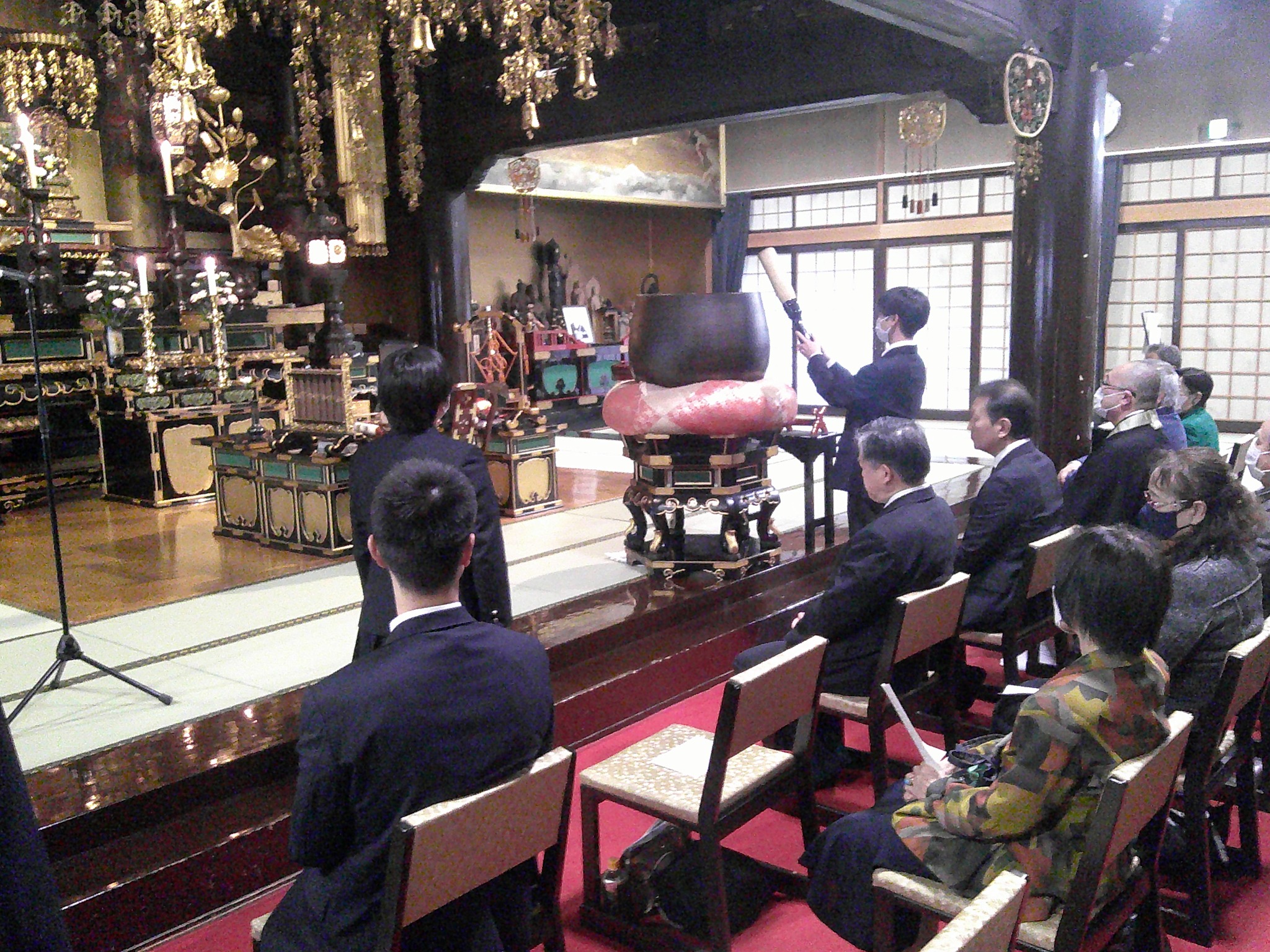 その後、本堂にしつらえた鐘を参加者全員が一打し、平和を祈り合掌しました。