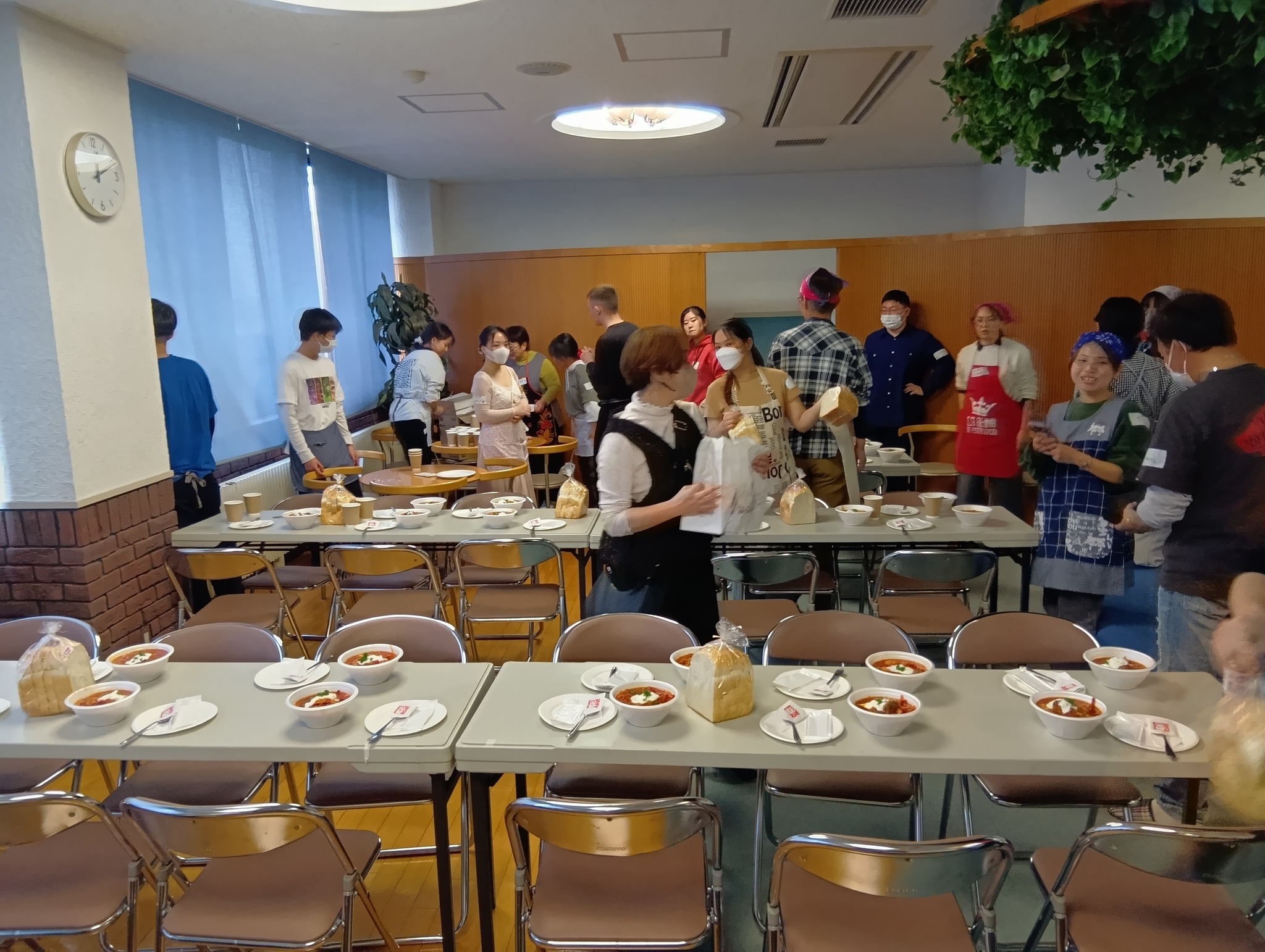 そして、男性は昼食会場を整えた後に、女性とともにその日のランチメニュー・ロシア料理「ボルシチ」の支度に取りかかりました。調理実習室(定員24名)では、交替しながらのビーツ、ジャガイモ、ニンジン、タマネギ、キャベツ、骨付き肉の切り込み、煮込み、味付けを石岡リュドミーラさん(ロシア)の指導の下で、多言語、ジェスチャーのやりとりが飛び交っていました。温かなボルシチは器に盛られ、パンも添えられて、神山チーフの「いただきます」を合図に楽しい会食がそれぞれのテーブルで繰り広げられました。留学生や日本人の若者は「おかわり」をしていました。